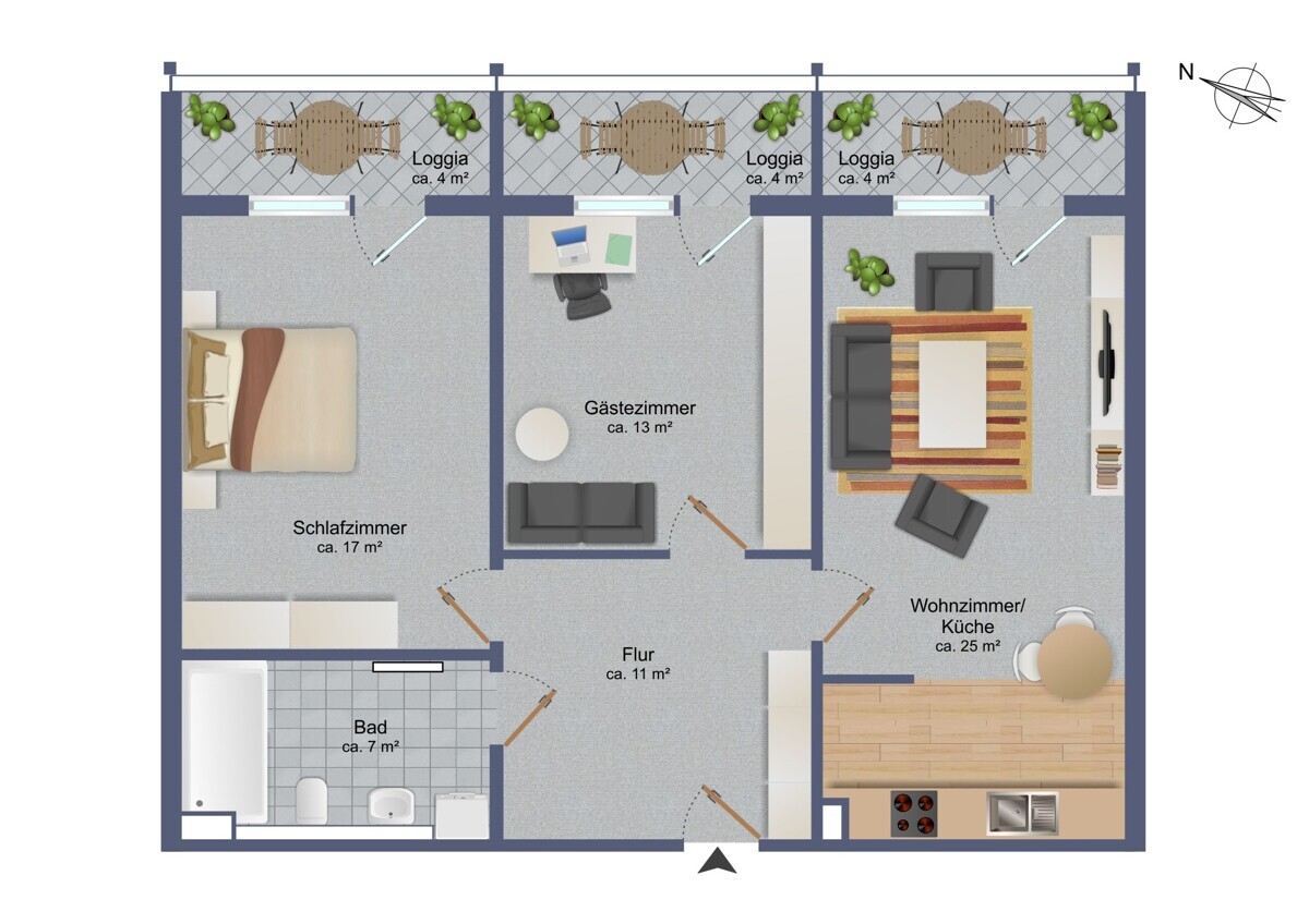 Die Grundriss-Skizze/n ist/sind nicht maßstabsgerecht und dient/en nur der Veranschaulichung. Die Maße sind am Bau zu prüfen.