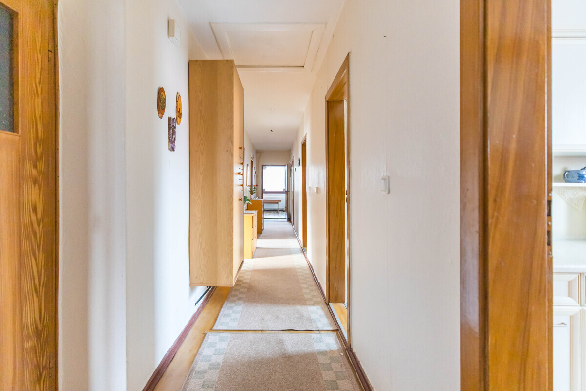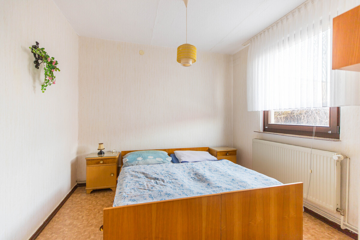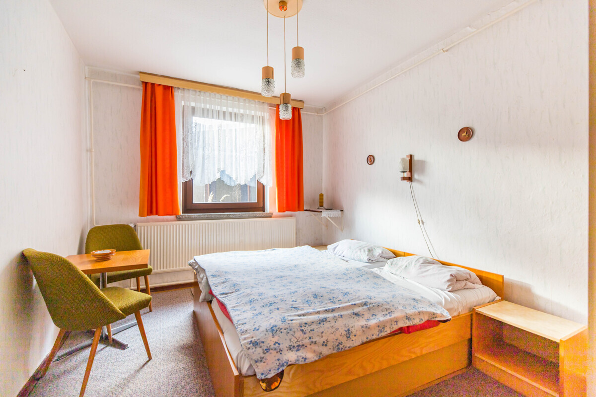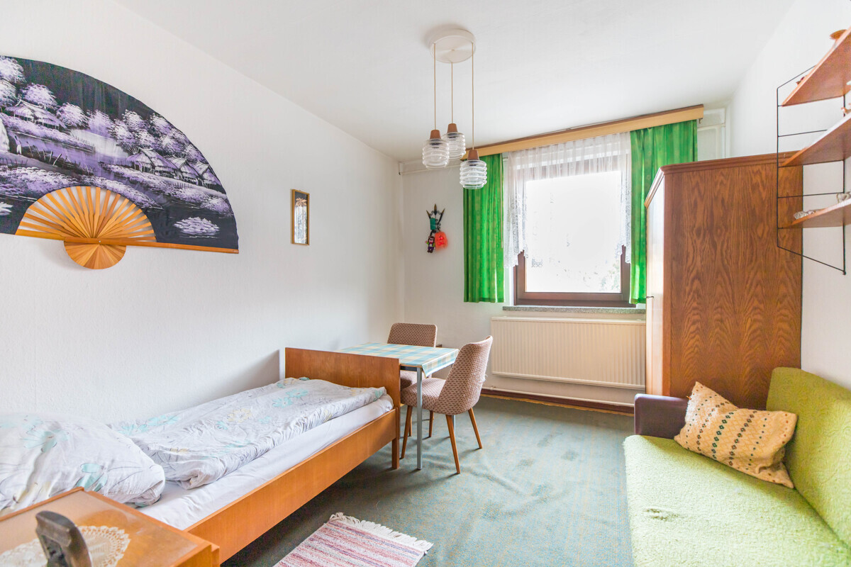 Neben dem Wohnzimmer stehen im Erdgeschoss sechs weitere Zimmer zur Verfügung, die flexibel als Schlaf-, Kinder-, Gäste- oder Arbeitszimmer genutzt werden können. Die Räume sind überwiegend ähnlich groß und ermöglichen somit eine gleichwertige Nutzung. Besonders hervorzuheben ist die praktische Ausstattung mit zwei Badezimmern im Erdgeschoss, die jeweils über eine Dusche sowie ein Fenster verfügen und damit für eine angenehme Belichtung und Belüftung sorgen. Ein zusätzlicher Windfang beziehungsweise Anbau erweitert die Fläche und bietet zusätzliche Möglichkeiten, beispielsweise als Garderobenbereich oder separater, ebenerdiger Zugang.