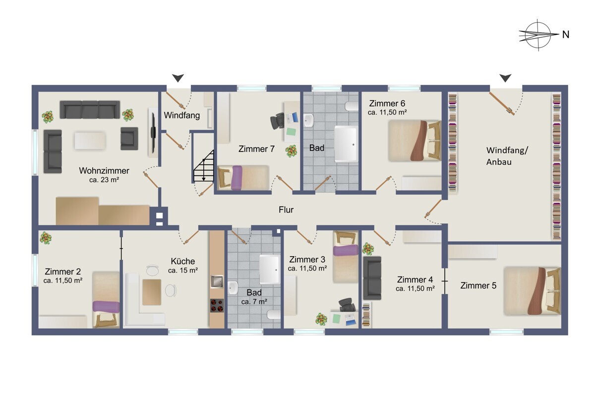 - sechs Zimmer mit jeweils ca. 11,50 ²