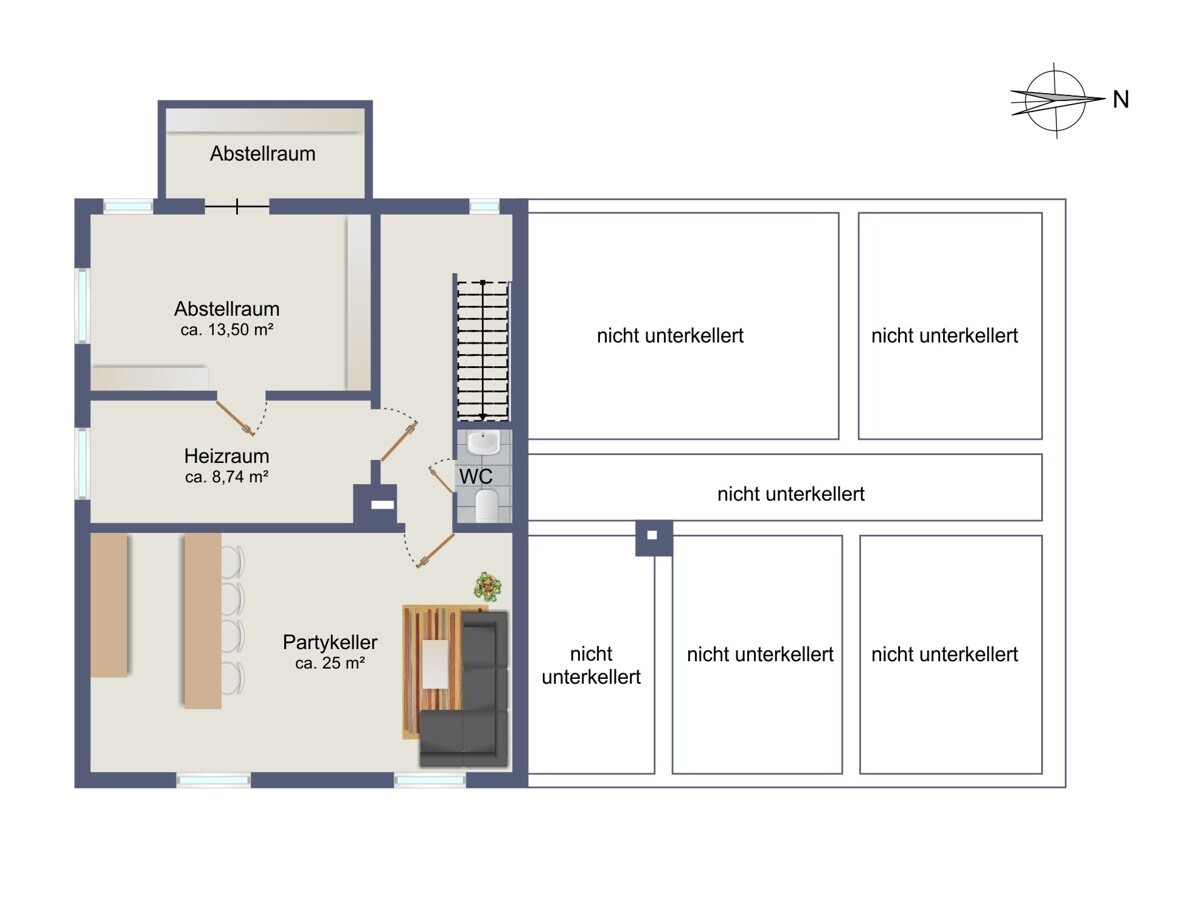 - Teilkeller mit großem Partyraum (ca. 25 m²), Gäste-WC, Heizungsraum, wohnlich ausgebauter Abstellraum und kleiner Abstellraum
